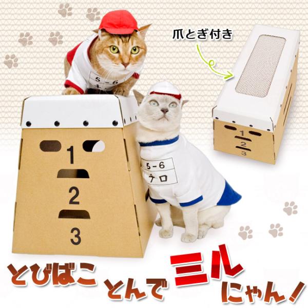 上のマット部分に爪とぎが付いているので、猫ちゃんが飛び乗る瞬間や爪とぎをしている最中に写真に撮れば、本当に跳び箱をしている様に写る!という代物です。